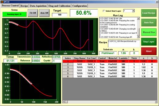 The sophisticated software package calculates the film growth in real time with the photometric measurement data, and it accurately determines the end points of each deposited layer. The small form factor of the OPC200 controller enables easy integration with any coating systems prepared with optical monitor windows. The software can easily communicate to the host system with simple and robust serial communication, thus realizing precise process control with accurate and consistent results.
